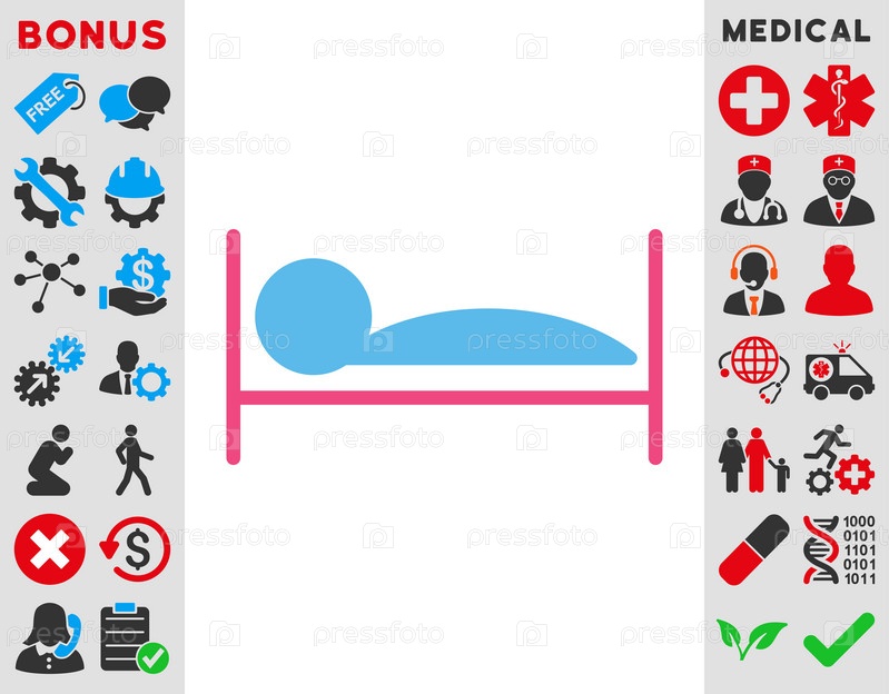 Пациент кровать иллюстрации значок. Стиль является биколор плоский символ, розовый и голубой цвета, закругленные углы, белый фон