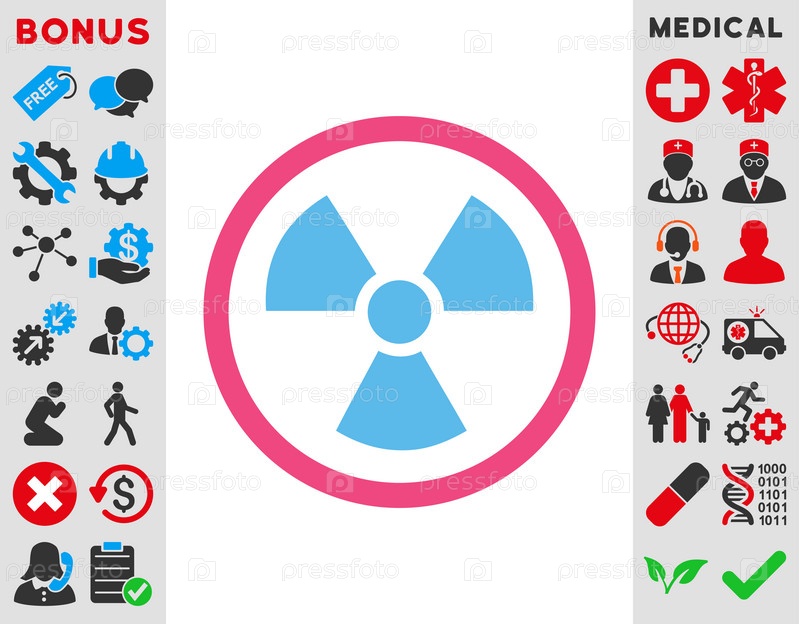 Икона иллюстрации опасности радиации. Стиль является биколор плоский символ, розовый и голубой цвета, закругленные углы, белый фон