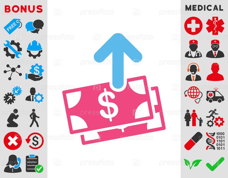 Тратите деньги иллюстрации значок. Стиль является биколор плоский символ, розовый и голубой цвета, закругленные углы, белый фон