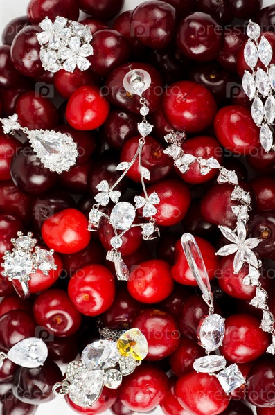 Блестящие украшения на фоне красной вишни