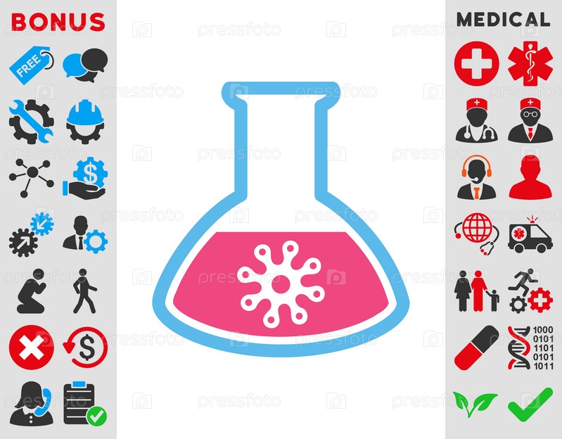 Вирус анализ иллюстрации значок. Стиль является биколор плоский символ, розовый и голубой цвета, закругленные углы, белый фон