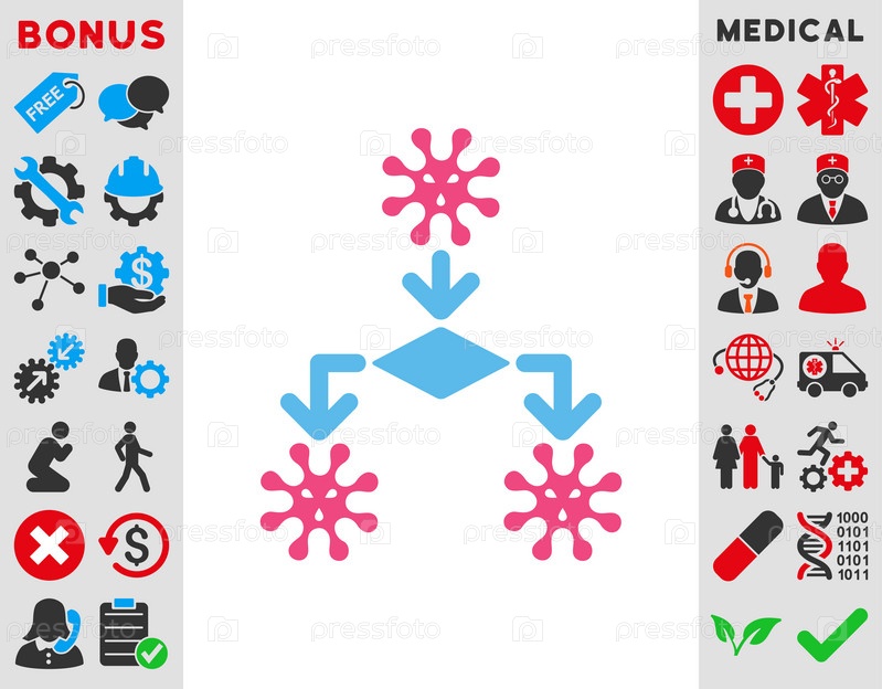 Вирус воспроизведение иллюстрации значок. Стиль является биколор плоский символ, розовый и голубой цвета, закругленные углы, белый фон