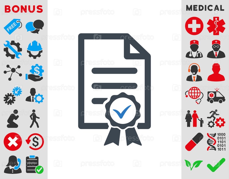 Сертифицированные иллюстрации значок. Стиль-биколор плоский символ, гладкая синего цвета, закругленные углы, белый фон