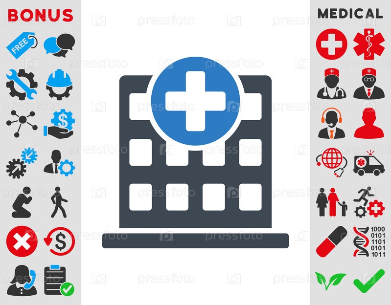 Клиника иллюстрации значок. Стиль-биколор плоский символ, гладкая синего цвета, закругленные углы, белый фон