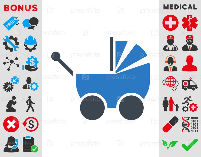 Детская коляска иллюстрации значок. Стиль-биколор плоский символ, гладкая синего цвета, закругленные углы, белый фон