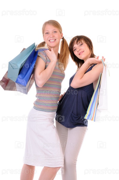 Портрет молодых девушек с пакетами в руках на белом фоне