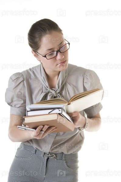 Портрет молодой девушки с книгами в руках на белом фоне