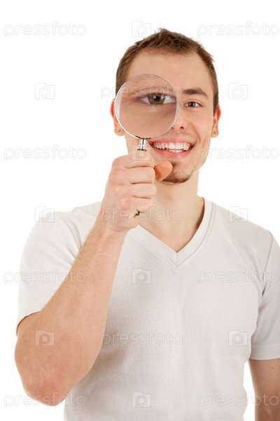 Портрет молодого парня с лупой на белом фоне