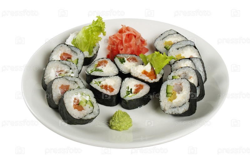 Разные японские роллы на белой тарелке