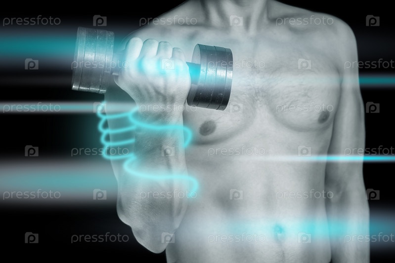 Мужчина держит гантелями