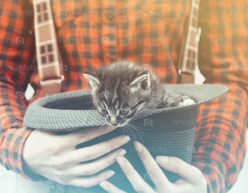 Женщина держит шляпу с котенком