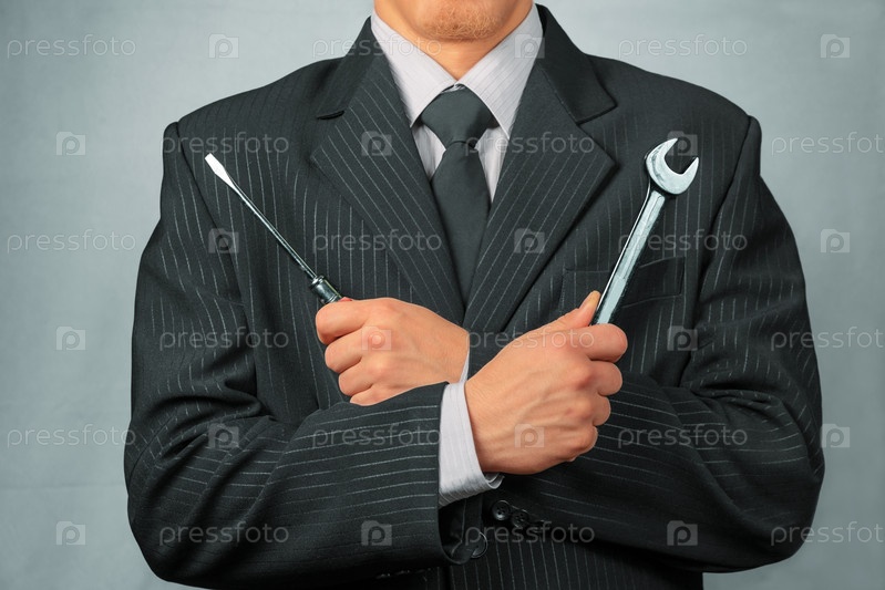 Бизнесмен с гаечным ключом и отверткой