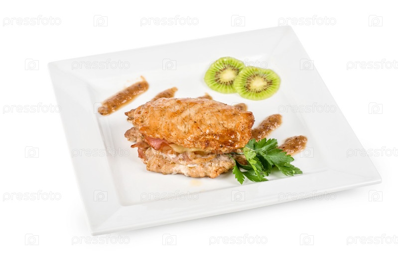 Отбивная из свинины с киви и петрушкой на тарелке