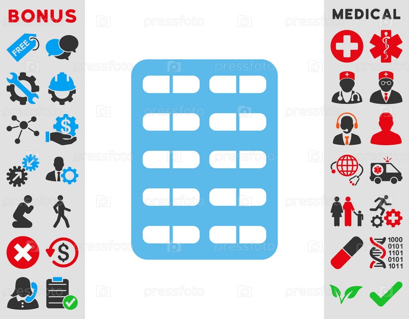 Таблетки волдыря иллюстрации значок. Стиль является плоской символ, синий цвет, закругленные углы, белый фон