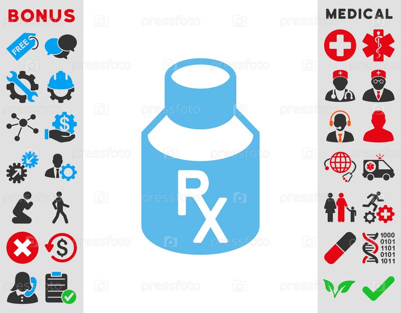 Рецепт во флаконе иллюстрации значок. Стиль является плоской символ, синий цвет, закругленные углы, белый фон