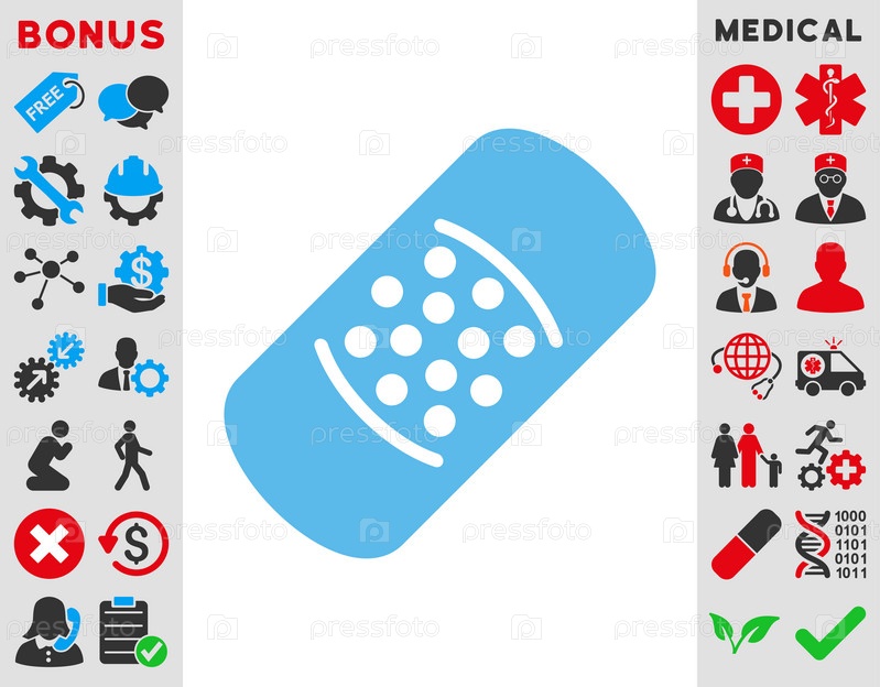 Пластырь иллюстрации значок. Стиль является плоской символ, синий цвет, закругленные углы, белый фон