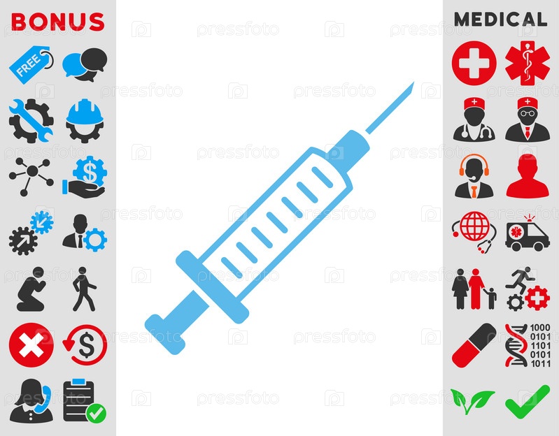 Шприц иллюстрации значок. Стиль является плоской символ, синий цвет, закругленные углы, белый фон