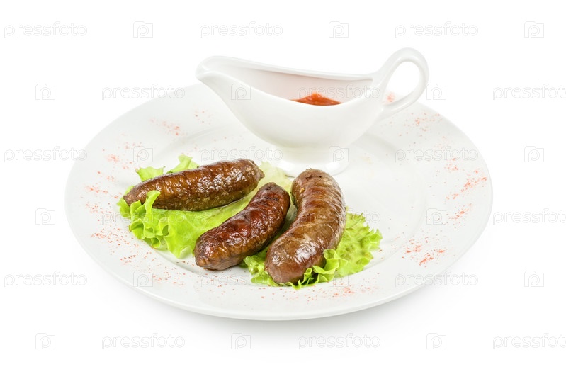 Жареные колбаски из дичи с листьями салата и соусом, белый фон