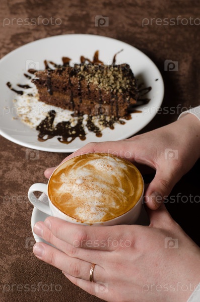 Чашка каппуччино в руках и пирожное на тарелке на столе