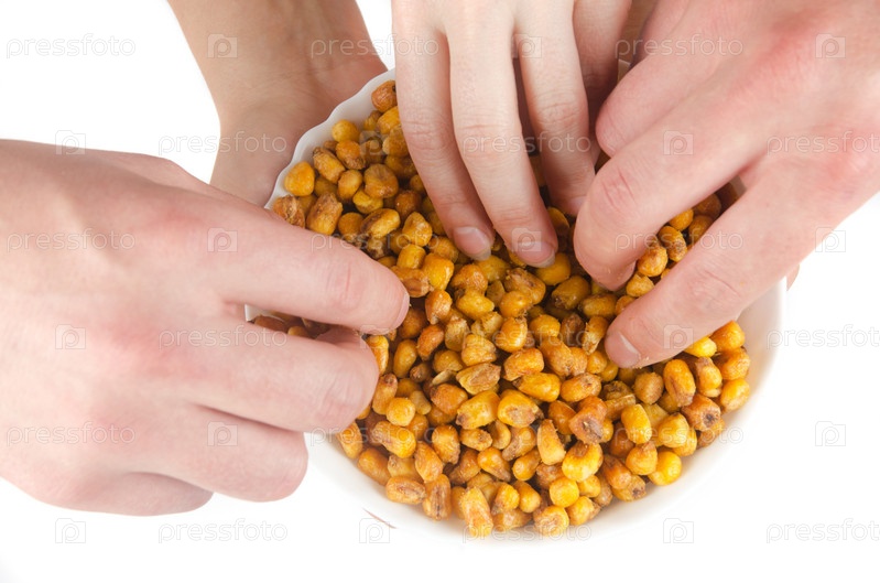 Руки берут жареную кукурузу из тарелки