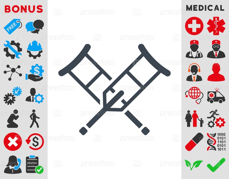 Костыли иллюстрации значок. Стиль является плоской символ, гладких синий цвет, закругленные углы, белый фон