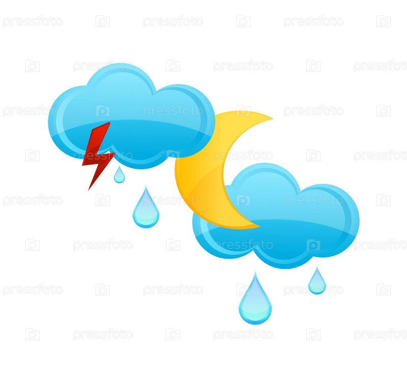 Дождевые тучи, молния и луна, иллюстрация на белом фоне