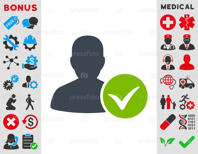 Пациент ОК иллюстрации значок. Стиль является плоской символ, гладких синий цвет, закругленные углы, белый фон