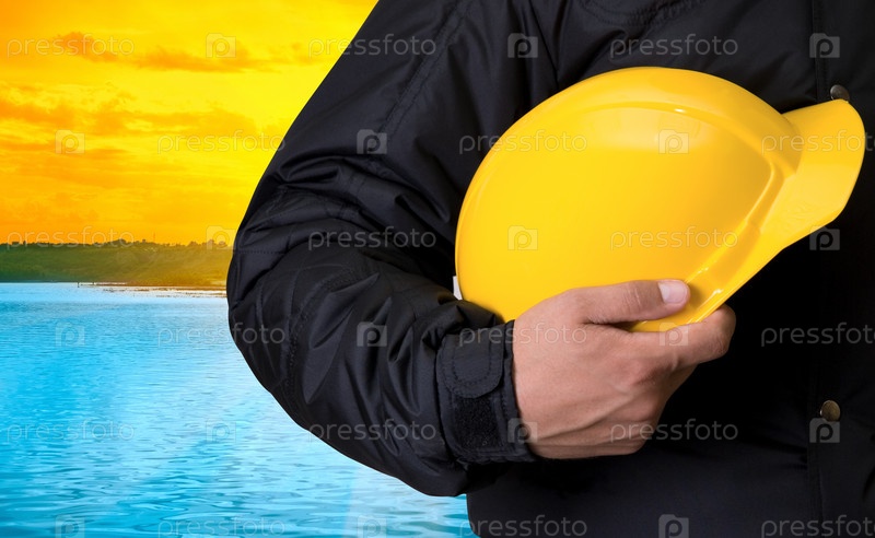Строитель с каской на берегу озера, крупный план