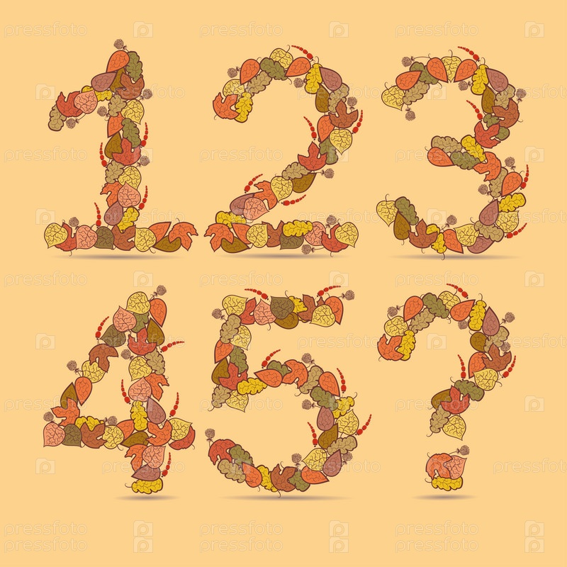 Цифры 1, 2, 3, 4, 5 и ? знак в осеннем стиле из листьев на бежевом фоне