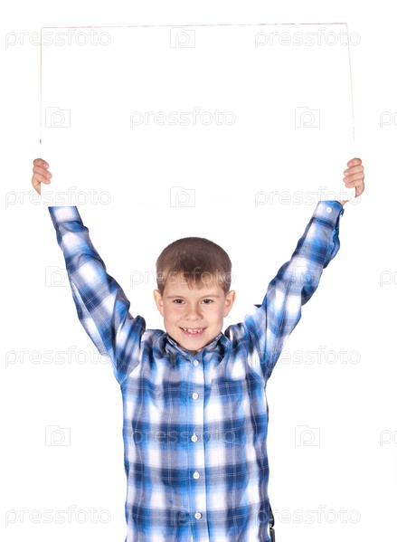 Мальчик держит высоко над головой пустой плакат