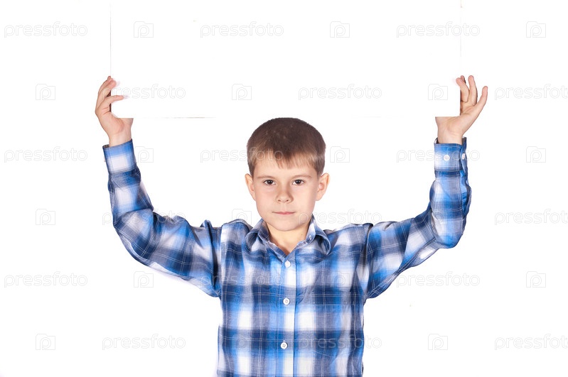 Мальчик держит над головой пустой плакат