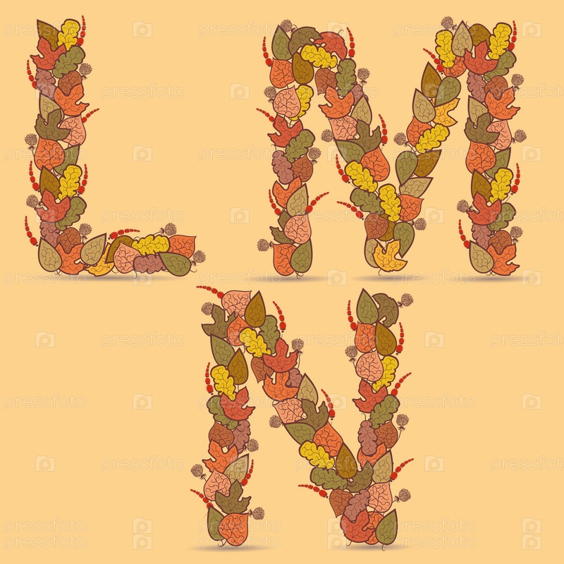 Буквы L, M, N в осеннем стиле из листьев на бежевом фоне