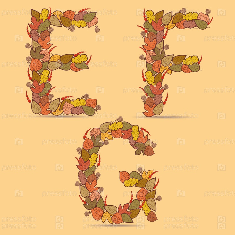 Буквы E, F, G в осеннем стиле из листьев на бежевом фоне