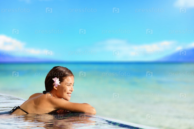 Расслабляющий бассейн женщина на праздники путешествия