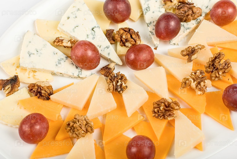 Различные сыры, грецкие орехи и виноград на тарелке