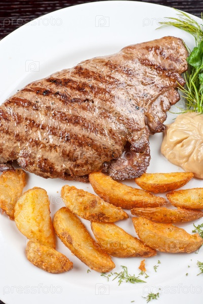 Стейк из говядины с жареным картофелем, зеленью и соусом