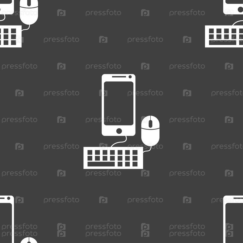 Смартфон, клавиатура, мышь знак значок. Бесшовный узор на сером фоне. Вектор