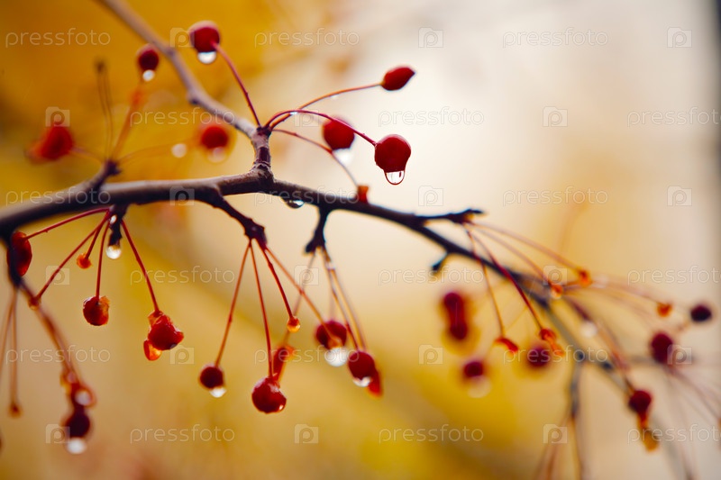 Осенняя ветка с красными ягодами под дождем