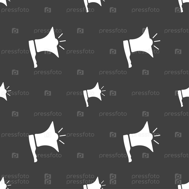 Мегафон значок. Символ громкоговорителя. Бесшовный узор на сером фоне. Вектор