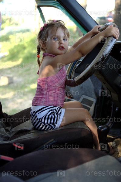 Портрет девочки, сидящей за рулем автомобиля