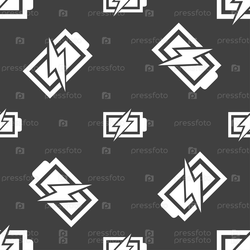 Зарядки знак значок батареи. Символ молния. Бесшовный узор на сером фоне. Вектор
