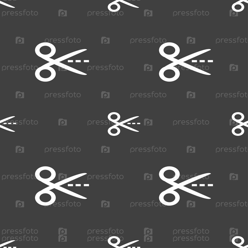 Ножницы с вырезать штрих пунктирной линии знак значок. Портной символ. Бесшовный узор на сером фоне. Вектор
