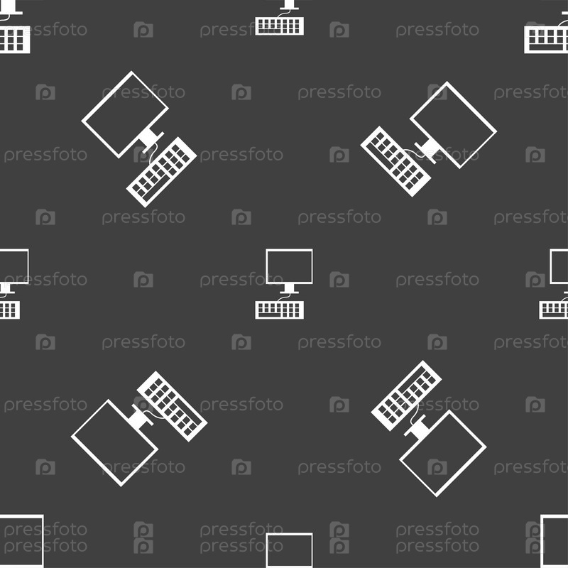 Монитор компьютера и клавиатуры значок. Бесшовный узор на сером фоне. Вектор