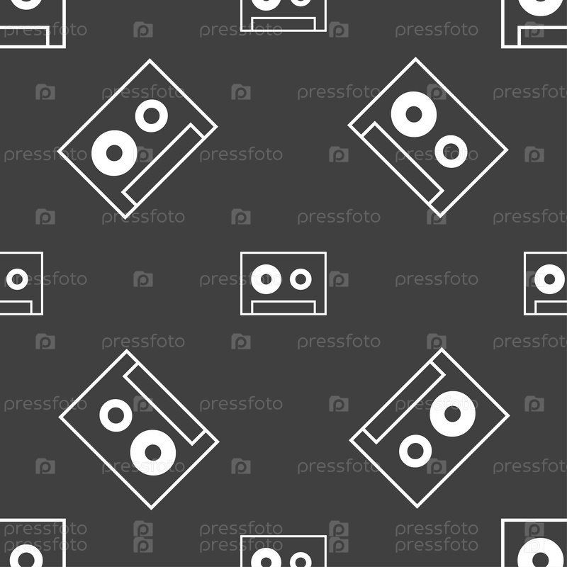 Значок знак кассеты. Символ аудиокассету. Бесшовный узор на сером фоне. Вектор