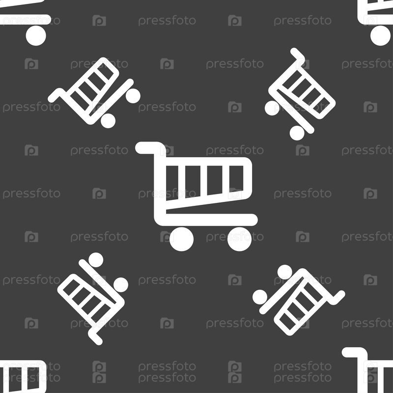 Торговый знак значок Корзина. Онлайн Покупка кнопку. Бесшовный узор на сером фоне. Вектор
