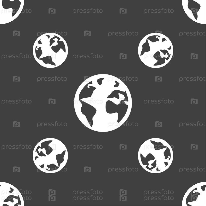 Глобус знак значок. Символ географии карта мира. Глобус на стенде для изучения. Бесшовный узор на сером фоне. Вектор