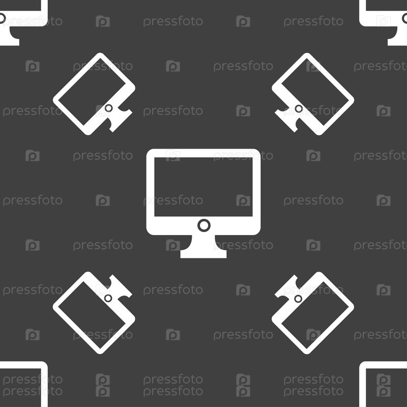 Знак значок компьютер широкоформатный монитор. Бесшовный узор на сером фоне. Вектор