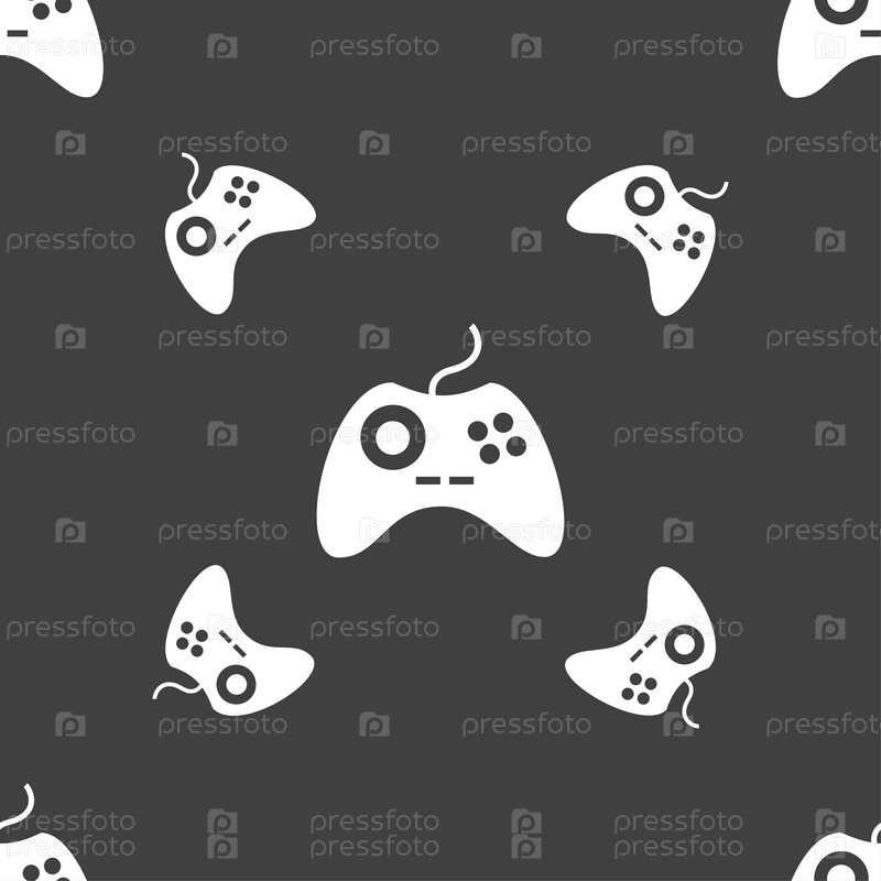 Знак иконку джойстика. Видео игры символ. Бесшовный узор на сером фоне. Вектор
