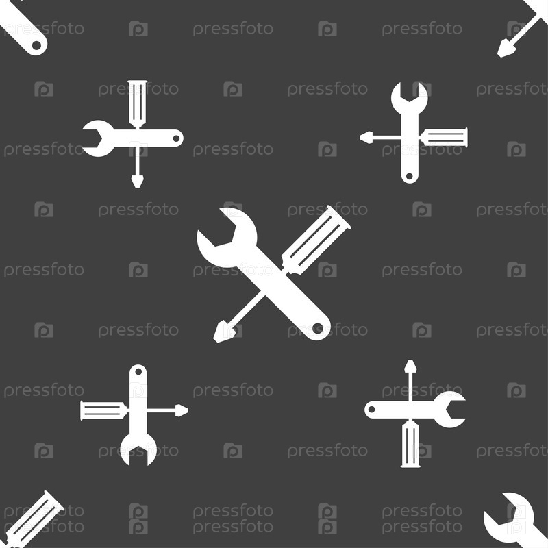 Ремонт инструмента знак значок. Символ службы. Отвертка с помощью гаечного ключа. Бесшовный узор на сером фоне. Вектор