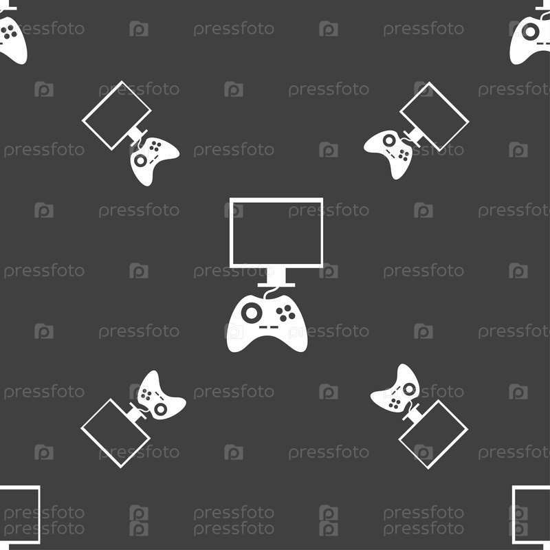 Джойстик и монитор знак значок. Видео игры символ. Бесшовный узор на сером фоне. Вектор